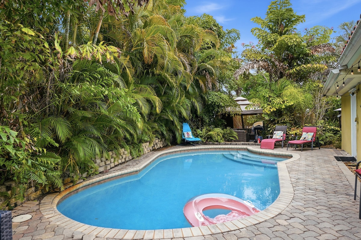 Welcome to Sunhouse, your private pool oasis in the perfect location: Just 1.3 miles from the beach and the Pompano Beach Fishing Village! That's a 5 min car ride! This house is the perfect Florida escape with everything you need plus the luxury of your own (BIG) heated pool! Relax in the backyard with comfy loungers, adirondack chairs, BBQ, and pool toys. Want to explore? Hop on our bikes for a quick 10-min ride to one of Florida's best beaches, where you'll find the best restaurants & shops!