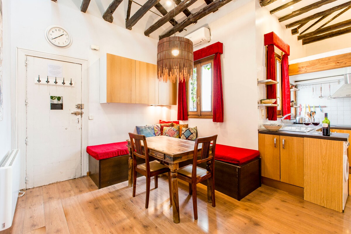 Zona monumental en el corazón de Lavapies, muy soleado y luminoso,techos muy altos con vigas vistas. Wifi de buena calidad Netflix. ascensor, bonitas vistas a la iglesia derruida de Escuelas Pias, actualmente biblioteca de la Uned. Muy cerca de todo.