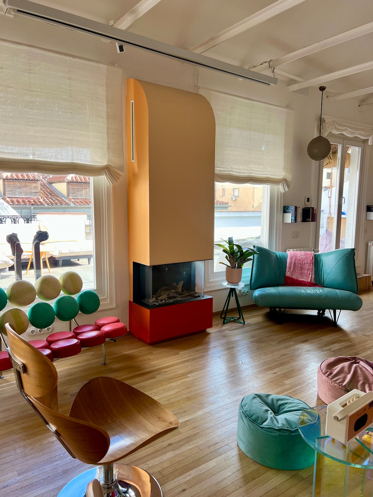 Playfully designed penthouse in the most centric and happening location in Madrid . Huge terrace, high ceilings up to 4.5 metres high, solid oak flooring, and tons of natural light. The apartment is furnished with unique pieces that breath joy and positivity. It has elevator that brings you up to 5th floor and a brand new gas fireplace to warm you up this season .