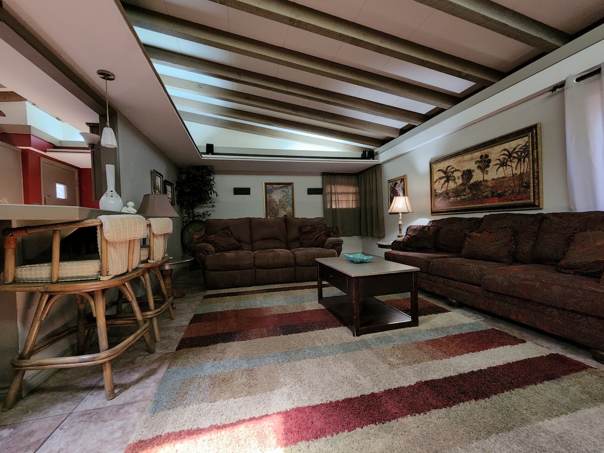 La casa tiene 2350 pies cuadrados. Tiene capacidad para 16 personas. Hemos aumentado la limpieza y desinfección, centrándonos en cualquier superficie que pueda haber tenido contacto. Creemos que nuestra casa es una alternativa viable y más segura que los hoteles, donde estás rodeado de muchas personas desconocidas. Nuestra casa también es una buena alternativa para estancias corporativas. Ocho camas, tres sofás y un corralito para bebés. Tenemos una cámara de timbre fuera de la puerta principal por motivos de seguridad... no hay cámaras dentro de la casa.