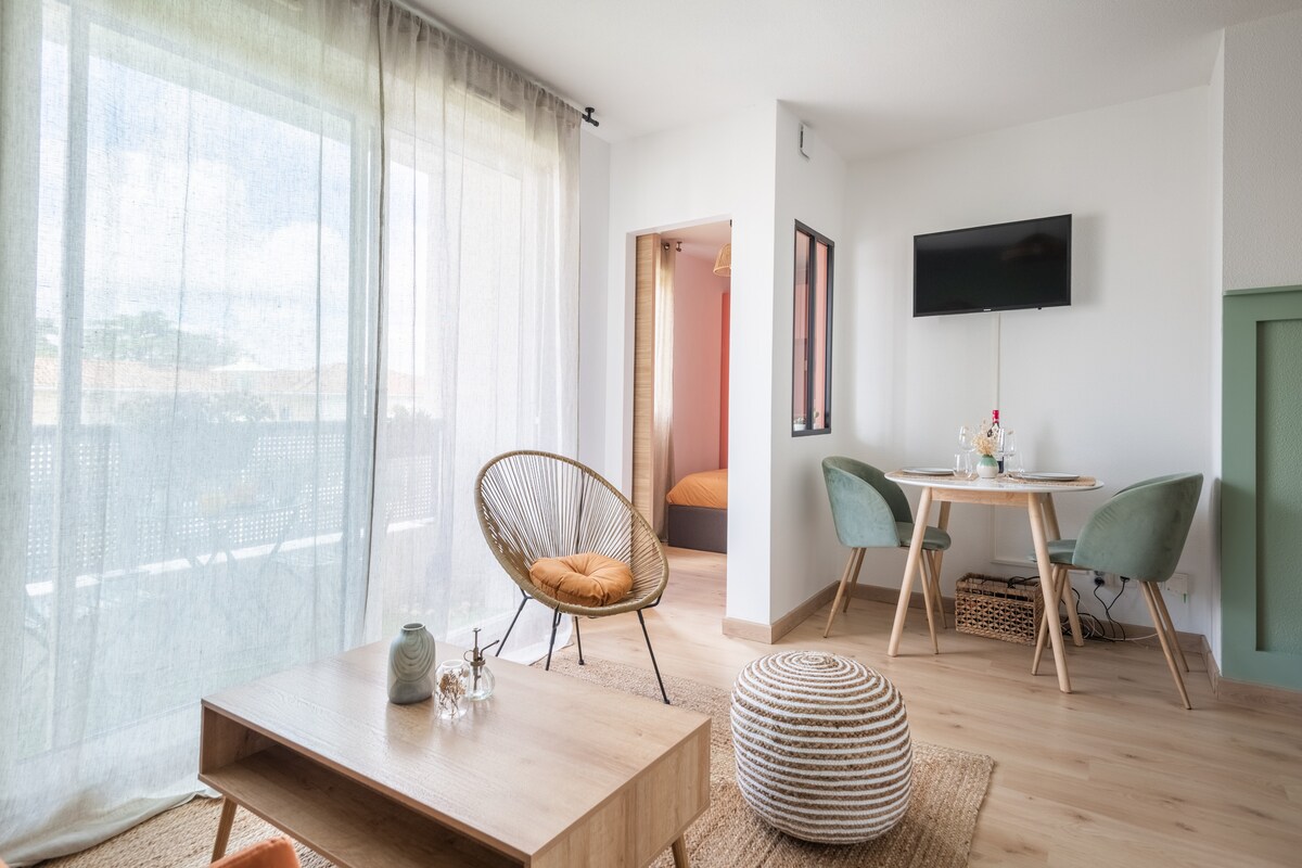 Bienvenido a nuestro encantador apartamento, tranquilo y cuidadosamente decorado y cerca de Burdeos. Con una ubicación ideal junto a la línea D del tranvía, puede llegar al centro de la ciudad de Burdeos en menos de 15 minutos. El apartamento puede alojar de 2 a 3 personas y está ubicado en una residencia segura equipada con ascensor y estacionamiento privado. - Ropa de cama de primera calidad. - Se proporcionan toallas y ropa de cama. - Se proporcionan té y café (Nespresso).