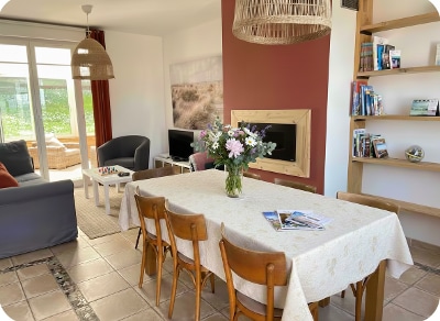 Jolie et vaste maison de pêcheur rénovée à la décoration chinée qui a conservé son charme d'antan. Esprit Maison de campagne, aussi accueillante l’été que l’hiver. Très bien exposée, vous aurez le soleil toute la journée. Un grand parasol vous permettra de prendre vos repas à l'extérieur sur une grande terrasse. En automne et hiver, vous pourrez cocooner au coin du feu. De nombreux livres, jeux de société, jouets, sont à votre disposition (pour petits et grands !) Venez vous y reposer !