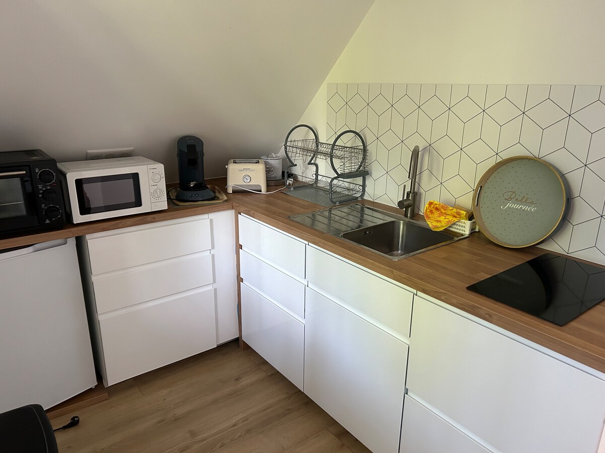 Bienvenue dans votre futur pied-à-terre au cœur des Flandres ! Que vous soyez en déplacement professionnel, en escapade romantique ou de passage pour découvrir notre belle région, ce studio moderne entièrement rénové a été pensé pour votre confort. Le studio est accolé à notre habitation familiale avec entrée indépendante, il propose une terrasse plein sud avec jardin commun à notre habitation, lit 140x190 et un canapé convertible Draps, serviettes et produits d’hygiène fournis