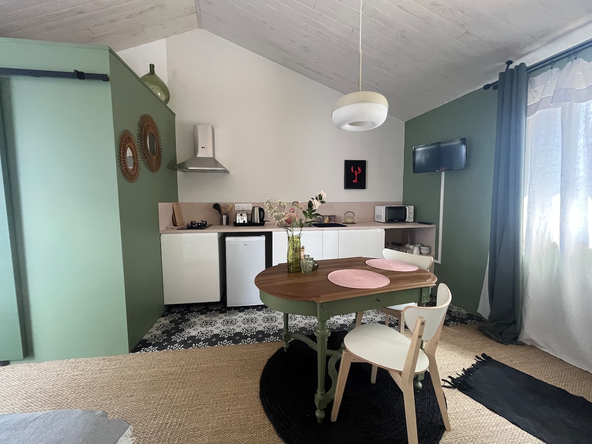 Hola Raymonde,es un estudio con aire acondicionado y patio privado ¡Regálate un encantador paréntesis en el campo, a solo 20 minutos de La Rochelle! Acogedor estudio de 25 m2 independiente de la casa principal • Patio ajardinado y ambiente íntimo •Cocina equipada •Baño,ropa de cama incluida •Aire acondicionado reversible,TV,WIFI •Aparcamiento gratuito en la calle La cama estará hecha para su llegada Bandeja de bienvenida con té y café Limpieza realizada por nosotros, por favor, lave los platos