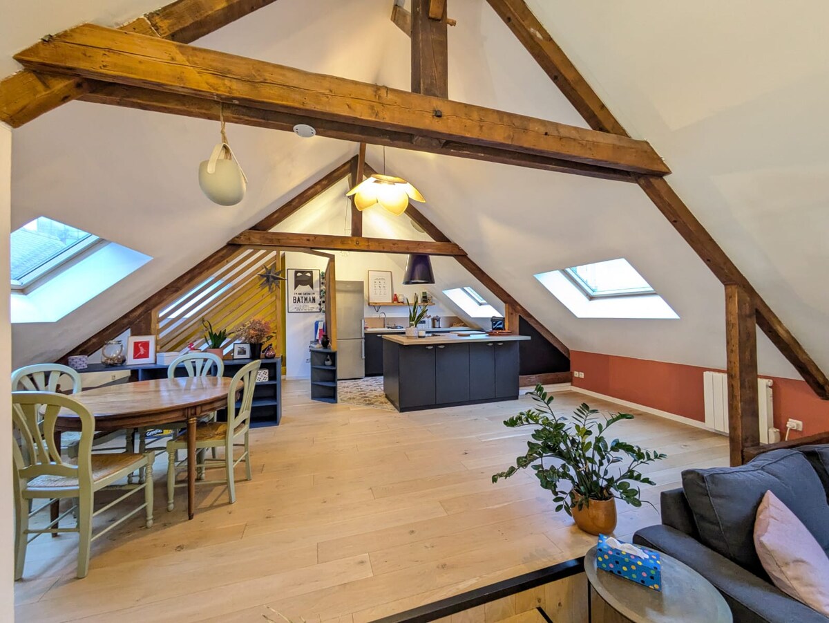 Magnífico dúplex en el corazón del centro histórico. Descubra Le Champ Jacquet, un dúplex que combina encanto y modernidad en el último piso de un hermoso edificio de Rennes. Disfrute de una vista de los tejados de Rennes, así como de los edificios con entramado de madera típicos de los alrededores. Este apartamento está cerca de restaurantes y calles comerciales del centro de la ciudad. El transporte (metro y autobús) está a menos de 2 minutos a pie. Ponte en contacto conmigo directamente. ¡Te responderé enseguida!