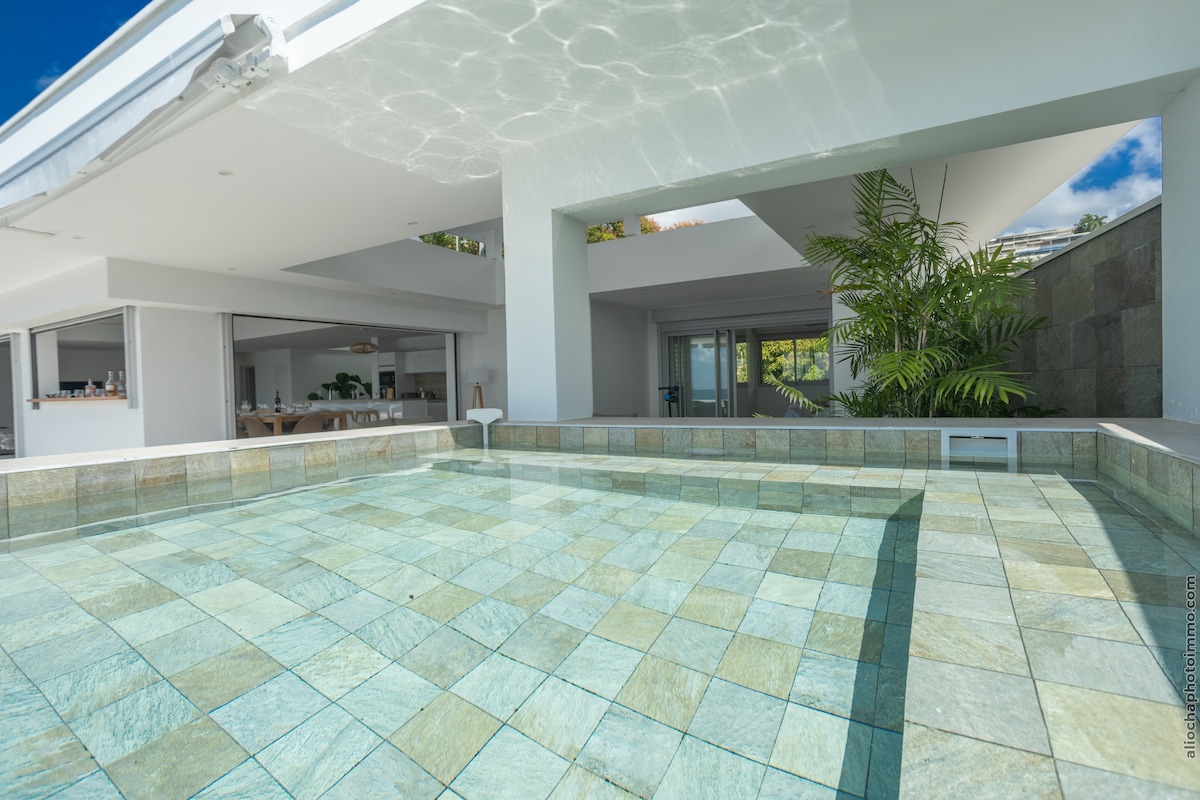 Impresionante apartamento en planta superior con piscina de inmersión. Los 3 dormitorios principales con baño privado, una oficina, el acceso privado al ascensor y amplias zonas de estar con una gran sala de estar, cocina con isla central, mesa de comedor para 12, jardín interior, logia cubierta con gran salón y zona de sol, así como un bar con vistas al mar, hacen que este apartamento sea excepcional. Ubicado en Schoelcher, cerca de restaurantes, puedes nadar fácilmente con las tortugas o simplemente admirar las puestas de sol.