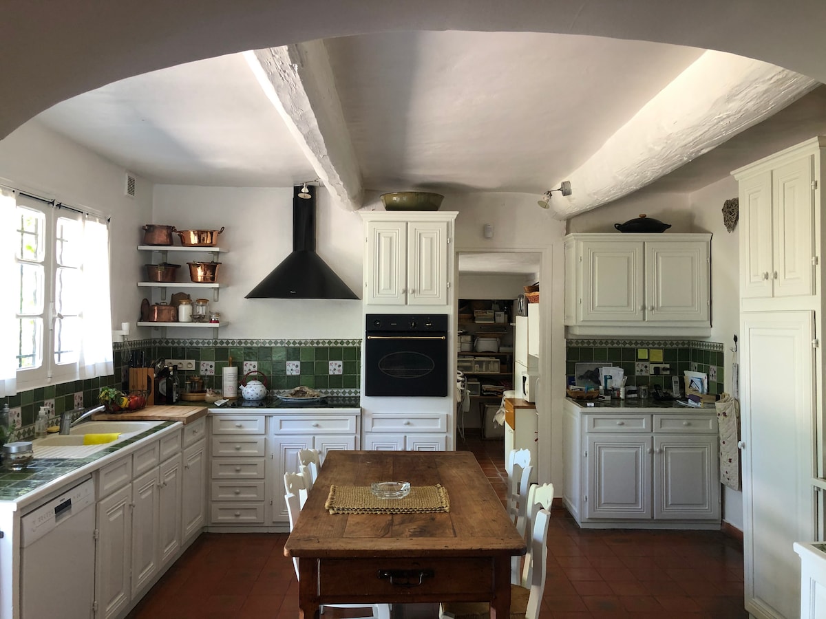La casa, un antiguo «mas» provenzal cuyo núcleo central data de 1600, tiene una superficie de unos 350 metros cuadrados. En la planta baja hay una sala de estar con chimenea, una cocina equipada con todos los electrodomésticos, un lavadero con lavadora y secadora, un baño, un gran comedor con chimenea, un estudio con chimenea y un dormitorio doble con baño. En la segunda planta se encuentran las otras 5 habitaciones. La casa está rodeada por un jardín vallado de unas 3 hectáreas que garantiza una privacidad absoluta.