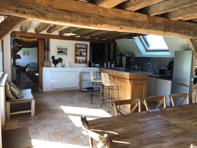 Situada a lo largo de la playa de arena que va de Honfleur a Deauville, esta casa ofrece un entorno excepcional para su estancia en Normandía: una VISTA AL MAR y un entorno con ENCANTO con sus entramados de madera y piedras en el corazón de los huertos de manzanas con sidra del Pays d 'Auge. Este antiguo taller del pintor Roland Oudot acoge grandes volúmenes y un amplio jardín (delantero y trasero) que garantizan comodidad y tranquilidad en un ambiente cálido con una decoración cuidada. Honfleur 2,5 km, Deauville 11 km