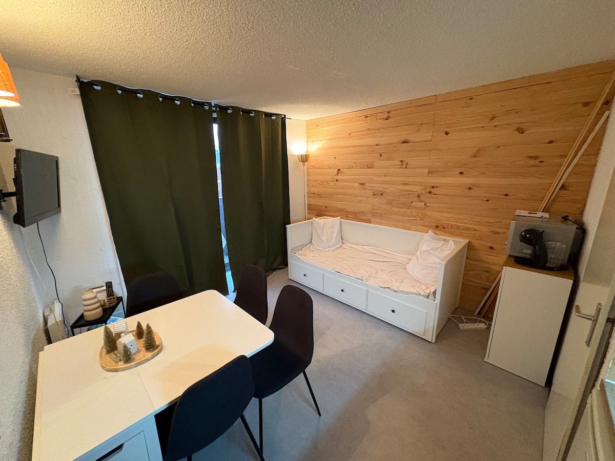 Acogedor estudio en residencia tranquila. - Zona de montaña (literas) - Aseo independiente (mueble suspendido de almacenamiento) - Cuarto de baño con bañera + columna de ducha - Sala de estar: Zona de comedor (mesa plegable + sillas + asiento con caja fuerte) Zona de cocina (placa de inducción, campana extractora, microondas, tostadora, hervidor de agua, cafetera Nespresso...) Un sofá cama para 2 personas (140/190) Muebles de almacenamiento - Balcón (mesa + sillas) Conexión wifi - 1 garaje cerrado + 1 armario para esquís - Aparcamiento exterior