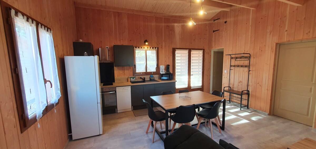 Grangette para 4 (2 adultos y 2 niños) en medio de la naturaleza. Planta baja de 20 m2 con «cocina» bien equipada, «salón - comedor» con TV y un baño. Terraza de 20 m2. La planta del altillo abuhardillado con una cama de 140 y dos camas de 80 (las dos habitaciones solo tienen una pequeña separación). Un sótano con lavadora, congelador y almacenamiento para su material. Exterior con piscina (verano) tumbona, spa (invierno) , juegos para niños, barbacoa de leña, (NO SE ADMITEN ANIMALES)
