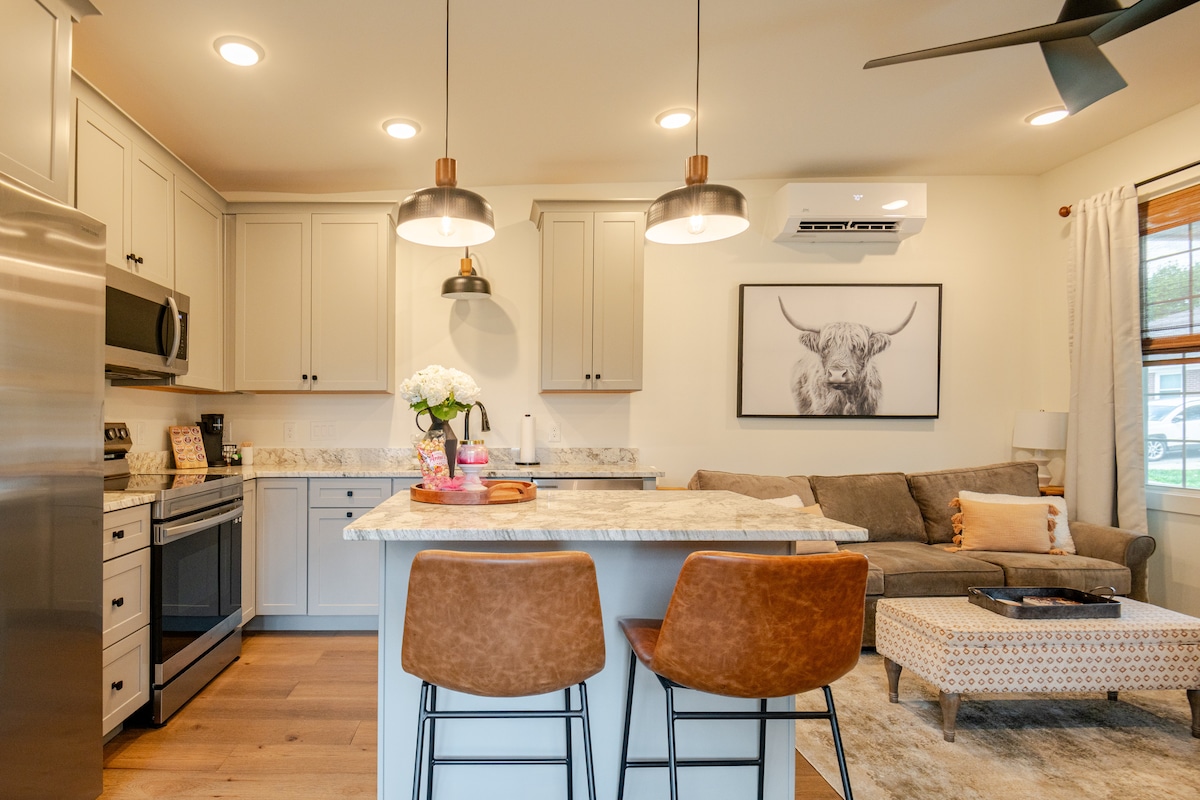 ¡Te damos la bienvenida a tu casa de un dormitorio recién reformada! Este elegante refugio cuenta con una espaciosa cama tamaño king y un cómodo sofá cama con un sobrecolchón para mayor comodidad. La reluciente cocina cuenta con electrodomésticos nuevos, perfectos para aventuras culinarias. Sal a tu patio trasero privado, completo con una estufa Solo para noches cálidas y relajadas. Además, disfruta de la comodidad de estar a poca distancia a pie del vibrante centro de la ciudad. ¡Tu hogar ideal lejos de casa te espera!