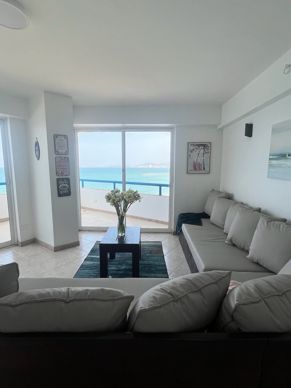 Bello apartamento frente a la playa, bellísima vista con espectacular balcón desde el salón o la habitación, despertarás con su bello amanecer y dormirás con el ruido del mar.. su salón con amplio espacio y en el balcón grande podrás disfrutar de café, parrillas o simplemente descansar viendo el mar 🌊.!