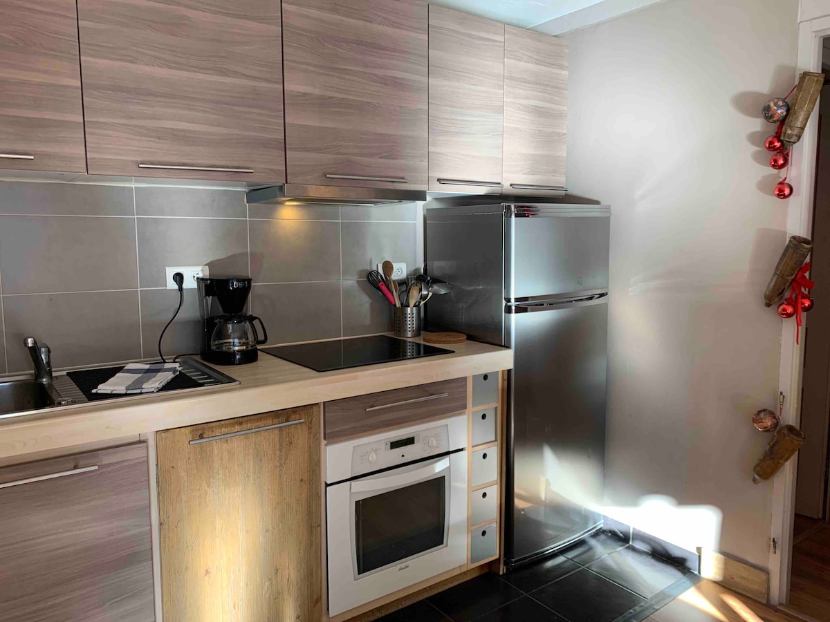 Appt de 48 m2, rénové ambiance montagne, vue magnifique vallée Vous disposerez - d'un espace de vie avec salon possibilité couchage, -cuisine neuve entièrement équipée; 2 chambres : - 1 suite parentale avec 1 lit double, salle de bain baignoire - 1 chambre avec 3 couchages 1 lit double et un lit mezzanine adulte - 1 salle de douche avec cabine, WC et lave linge - 1WC indépendant Sèche chaussures et gants Retour skis au pied, piste luge au pied de la résidence. Commerces 300 m