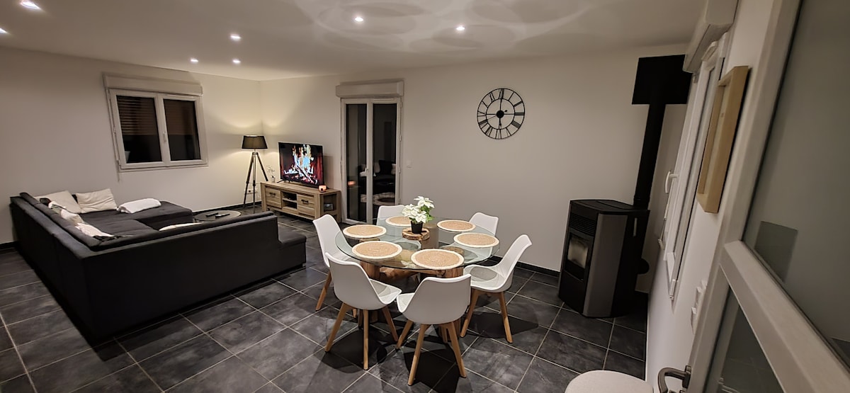 💥 Cesta de bienvenida a su llegada 💥 Balneoterapia con agua tibia mantenida, como un jacuzzi real TV 🫧 gigante de 99 pulgadas Cama tamaño king 🎥 ultra cómoda Chimenea 💤 eléctrica 🔥 Tómate un descanso y escapa a este encantador nido de amor, elegante y cálido ✨ El apartamento ha sido cuidadosamente diseñado hasta el último detalle para ofrecerte una experiencia excepcional, combinando relajación y máximo confort. 🥰