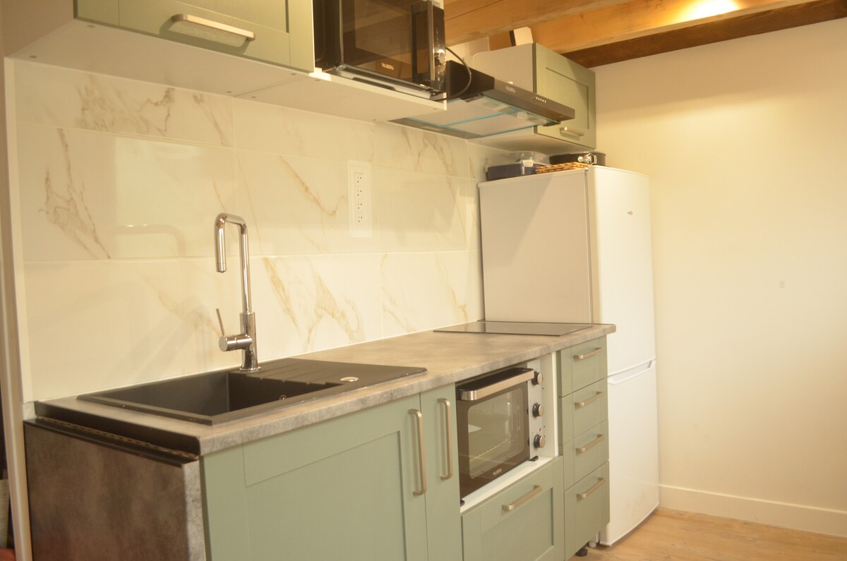 Pequeña casa unifamiliar de 2 habitaciones en un pueblo tranquilo con panadería - tienda de comestibles. Este alojamiento consta de un dormitorio (1 cama de 2 plazas de 140 y 1 cama de 70), un baño con ducha y un aseo separado arriba, una sala de estar con cocina equipada y amueblada en la planta baja con sofá cama y aseo independiente. TV, horno, microondas, nevera, cafetera + Nespresso, tostadora, hervidor de agua, toallas, paños de cocina, sábanas y edredones incluidos. Aparcamiento con 1 plaza y jardín PAT & SYL