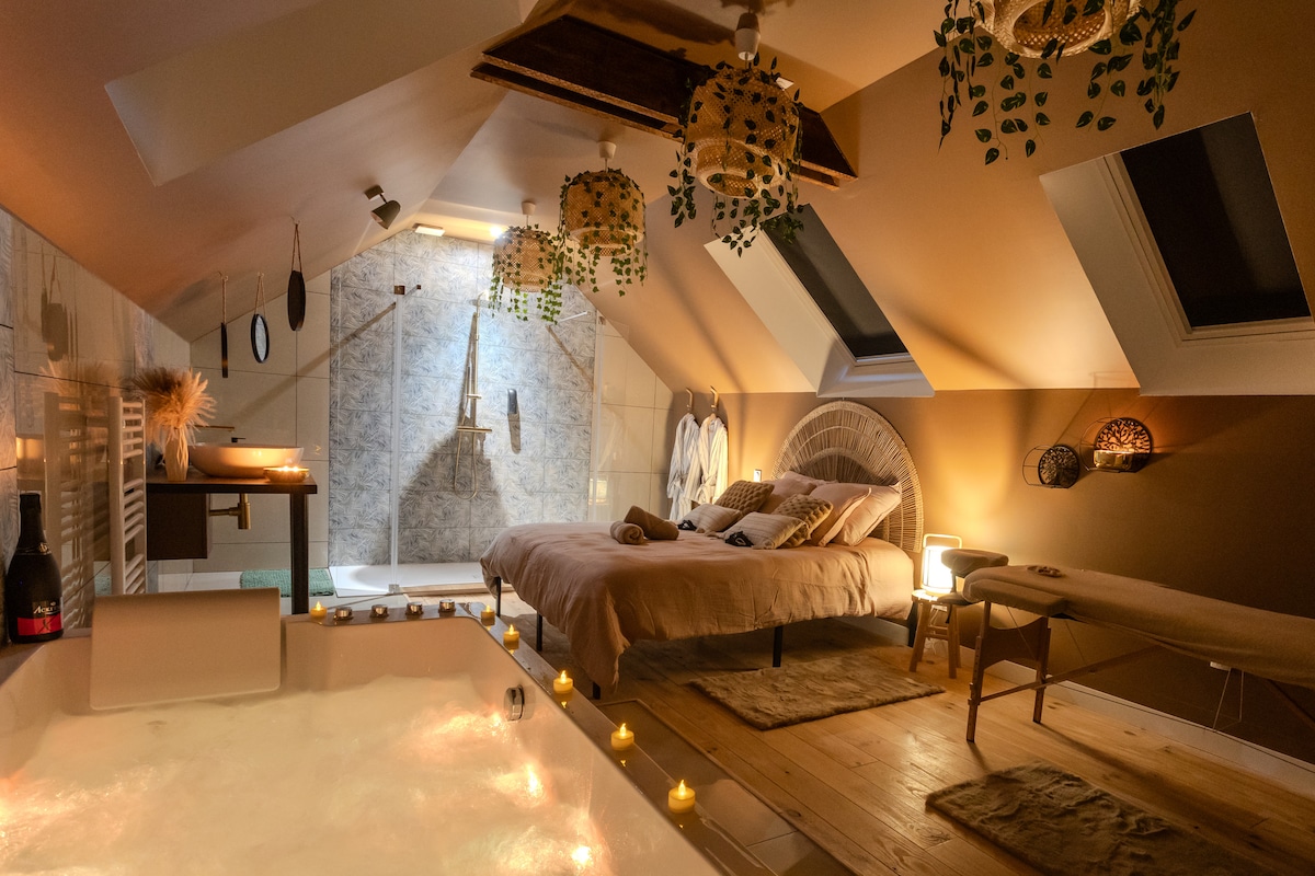 Ven a relajarte y pasar un rato fuera del tiempo en la Love Room «Suite Bali». Este apartamento de 45 metros cuadrados se encuentra en el centro de la ciudad de Angers y a 1 minuto a pie de la Place du Ralliement (plaza principal). Su gran bañera de hidromasaje, su ducha a ras de suelo, su patio y su sauna al aire libre le proporcionarán un momento único y relajante con su media naranja. Venga a viajar a la Suite Bali.
