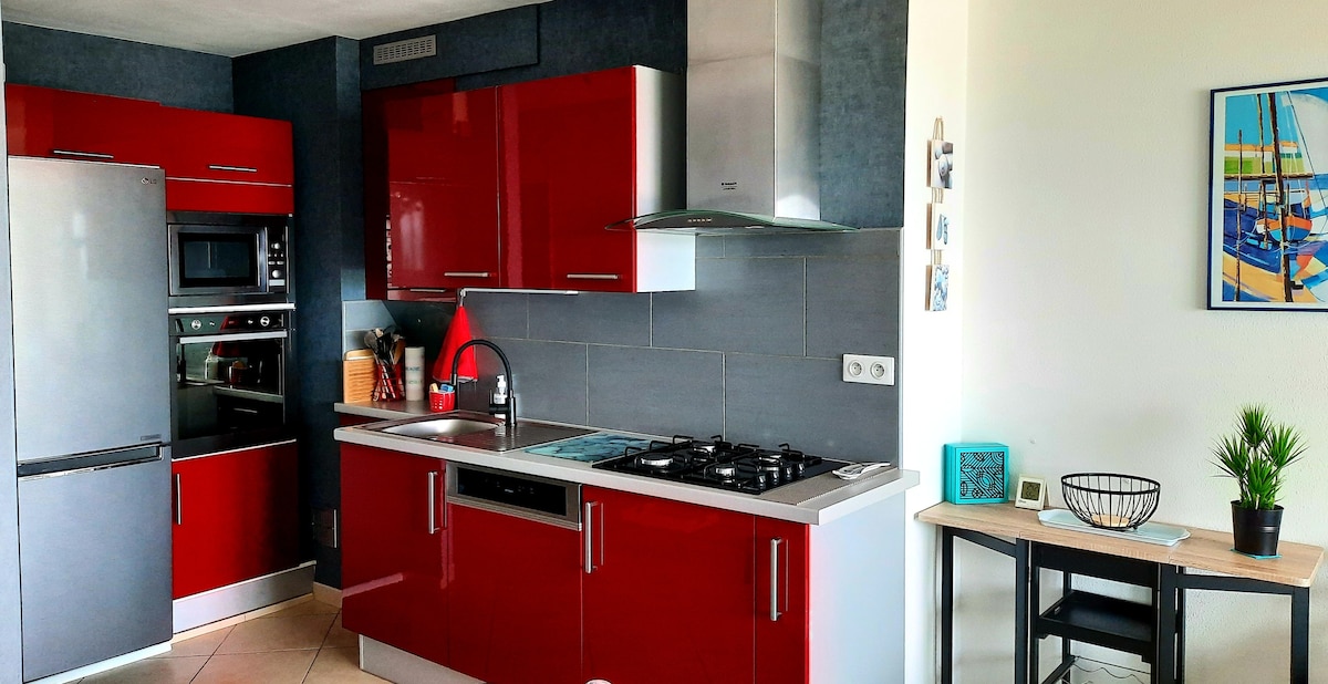 Frente al mar a 100 m (calle adyacente al mar), elegante, luminoso T3 1ª planta 3 estrellas, 2 dormitorios, 1 baño, terraza, cocina equipada con lavavajillas, lavadora, placa de inducción, Microondas Nevera-congelador Pequeño garaje subterráneo (coche urbano) Wifi de fibra SFR Barrio de los Presidentes. Autobús a 200 m Playa y todos los comercios a 170 m (panadería, pescadería, supermercado, carnicería, prensa, bar, restaurante, peluquería, farmacia) El mercado Arago a 6 minutos a pie Expo Sud-Ouest, calle tranquila y llena de encanto