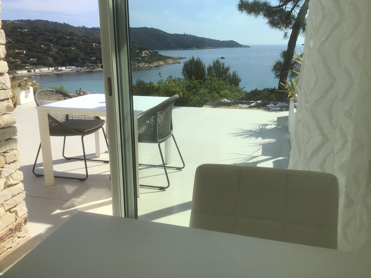 Bastidon localisé dans les hauteurs des Mas de Gigaro. Vue magnifique dans un écrin de verdure. Déco soignée. Idéal pour un couple. Accès à la piscine du domaine ainsi qu'à des courts de tennis (gratuit, sur réservation). Plage de Gigaro à 5 minutes de voiture ou 10 à vélo ! Accès rapide à pied aux sentiers du Cap Lardier (sentiers vélo et pédestre). L'accès à la maison se fait par des marches en traverses de chemin de fer.