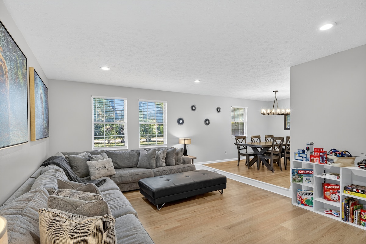 Disfruta de nuestro espacioso dormitorio principal, muebles nuevos, tranquilo patio trasero con jacuzzi para 2 personas, parrilla, cocina totalmente equipada, sala de juegos, aparcamiento conveniente y 3 amplios dormitorios. Contamos con todo lo necesario para estirar las piernas y relajarse. Ideal para visitar lugares de interés en Cincinnati (25 minutos) o Dayton (15 minutos), así como King's Island (15 minutos). Cerca de tiendas, restaurantes y entretenimiento. ¡Los niños y las familias son bienvenidos!