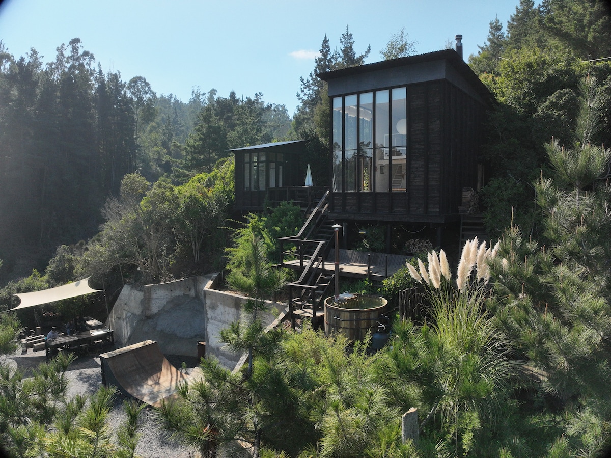 Cabaña de madera en medio de la naturaleza, con increíbles vistas a la laguna de cáhuil y a una quebrada de bosque nativo. Este mágico lugar está bien conectado con las principales atracciones de la zona, pero a la vez retirado lo justo y necesario para disfrutar del silencio del bosque. Tiene terrazas para tomar sol, hot tub, rampa de skate, fogón, parrilla a gas y a leña. Full señal celular y wifi