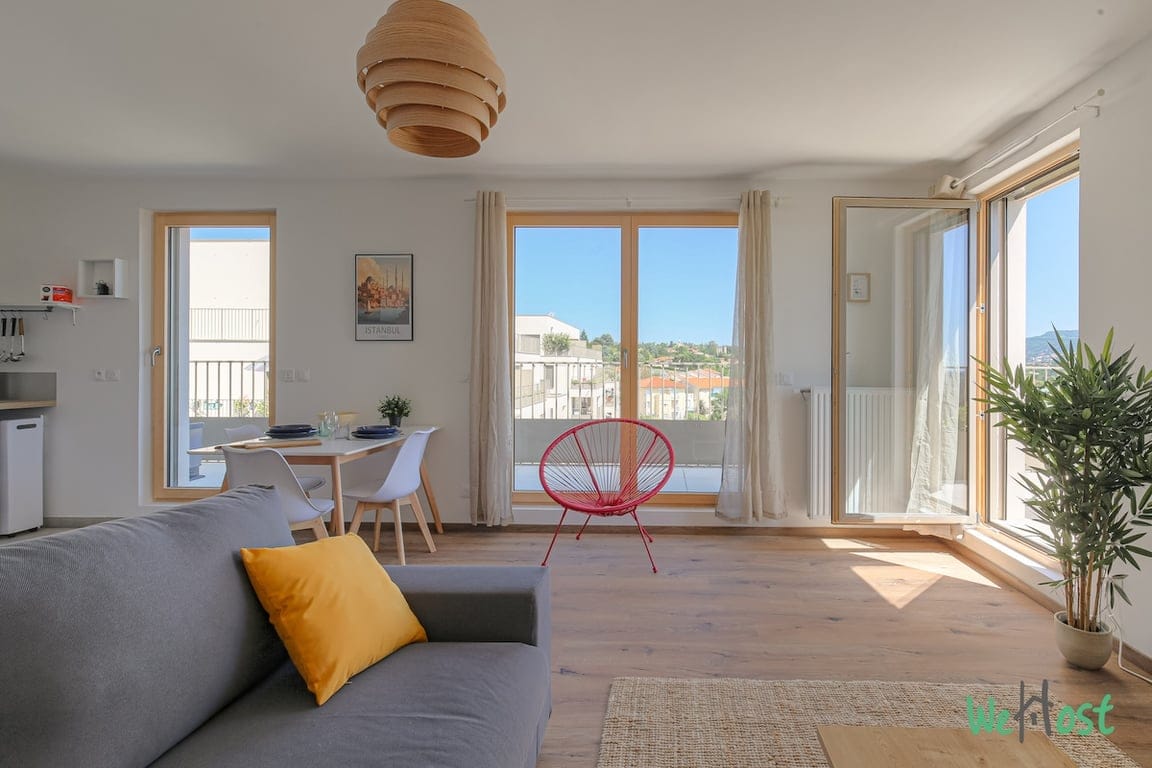 Alójate en este estudio reciente en Ecully, que ofrece un ambiente moderno. El espacio habitable incluye una sala de estar con sofá cama y una cocina compacta totalmente equipada. Disfrutarás de una hermosa terraza. También encontrará a su disposición una lavadora, un microondas, una televisión y una cafetera. Se proporciona ropa de cama y una toalla por persona. Este estudio ofrece un fácil acceso al centro de Lyon en coche o en transporte público.