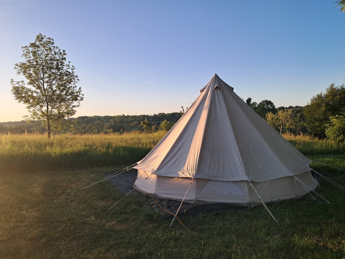 Lujosa tienda de campaña Lotus Belle en la tranquila campiña de Corrézien, ideal para parejas o familias pequeñas. En nuestro pequeño camping de seis parcelas, la tienda ofrece un espacio tranquilo y relajante con una cama cómoda, ropa de cama y una zona de cocina privada. Disfruta de la piscina, el bar y las deliciosas pizzas, o despierta con el canto de los pájaros y explora los senderos y pueblos cercanos. Relájate en el entorno natural tranquilo y privado para una experiencia única de glamping boutique con total comodidad.