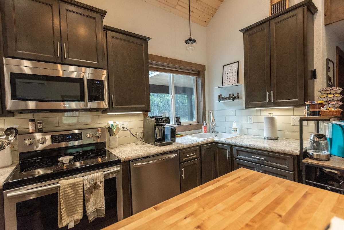 Situado en 2 acres de terreno arbolado privado, puedes relajarte y desconectar en este alojamiento tranquilo, silencioso y elegante ubicado a 5 minutos de la ciudad. Si te gusta el café, tenemos muchas opciones para ti. Disfruta de granos de café espresso recién tostados para usar con una máquina Latte Go o una cafetera. También ofrecemos una Keurig con una gran variedad de cápsulas. Todo lo cual puedes disfrutar sentado afuera alrededor de un pozo de fuego de propano. También hay disponibles una plancha, un pozo de fuego y bicicletas para divertirse al aire libre.