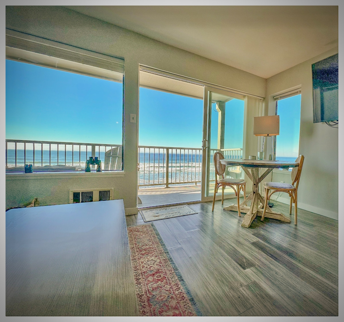 Perched on the top floor at the corner of the building, this oceanfront condo features breathtaking panoramic views of Nye Beach, Yaquina Head Lighthouse, and the shimmering Pacific Ocean — creating the perfect backdrop for a romantic seaside retreat. • 2 King Bedrooms • Ocean-view jacuzzi tub – unwind in style • Fully equipped kitchen • Games & DVDs for cozy nights • Baby gear included • Roku TV + Wi-Fi • Floor-to-ceiling views • 2 bathrooms • Easy checkout