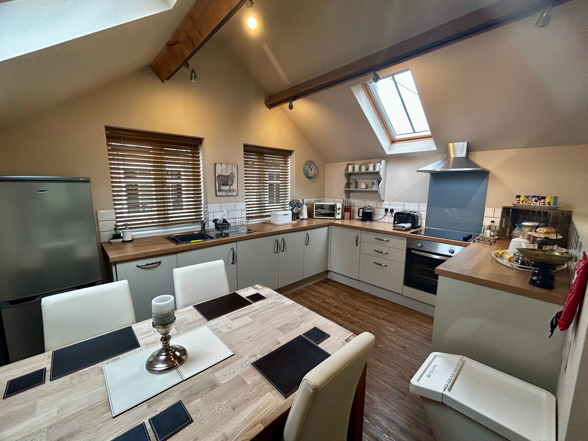 Tómate un descanso y relájate en este espacio rural tranquilo y elegante. Disfruta de pasar tiempo en un entorno de lujo, rodeado de tierras de cultivo y bonitas vistas con todos los servicios de tu hogar. Disfruta de las vistas desde tu cama tamaño king, la gran bañera independiente o el balcón Juliet. Relájate en la gran sala de estar viendo tus películas favoritas en el televisor inteligente de 75 pulgadas, wifi y sonido envolvente. Tienes una cocina equipada con cocina eléctrica con ventilador y 2 fogones para cocinar tus comidas y una mesa de comedor para comerlas.