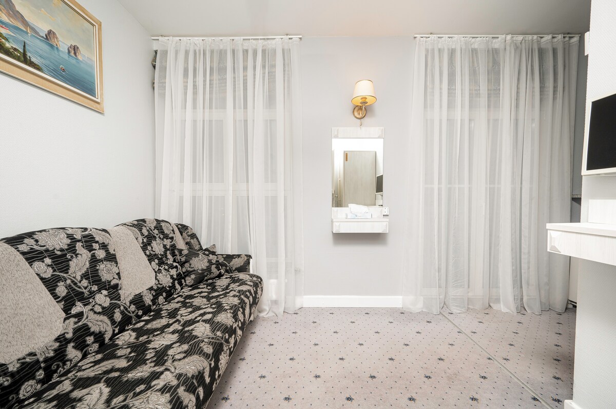 A spacious room with a bathroom and a kitchenette equipped with a refrigerator and essential kitchen utensils provides you with comfort and independence. Here, you can enjoy a roomy space with a bathroom featuring all necessary amenities. The kitchenette with a refrigerator and basic kitchen utensils offers you the opportunity to cook your own meals if you desire. It's an excellent choice for those who appreciate luxury and independence during their stay.