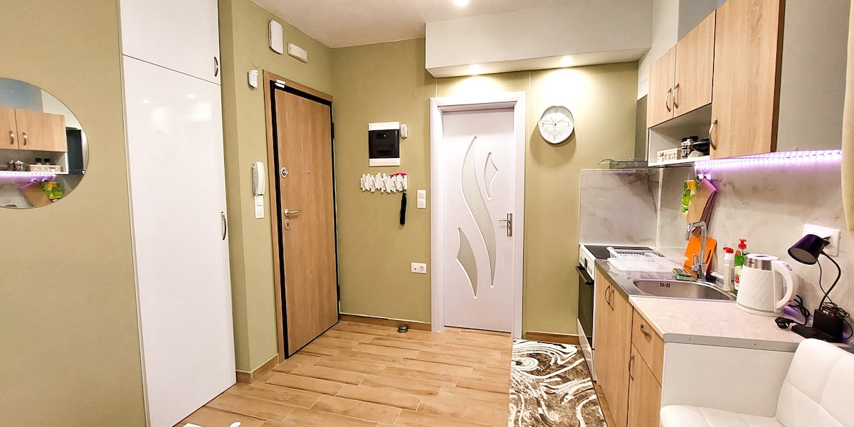 El apartamento tiene 25 metros cuadrados de tamaño y se encuentra en el corazón del centro de la ciudad de Katerini, en la calle Pezodromos (peatonal). Ofrece acceso directo (a 3 minutos a pie) a las cafeterías, los bares, restaurantes, supermercados, el estacionamiento municipal de bajo costo del estacionamiento municipal de bajo costo y la estación de autobuses local donde puedes tomar un autobús que conduce a la estación de tren y a la playa Paralia (en aprox. 15 minutos). El departamento está en el piso baja, está completamente renovado (en 2023) y equipado. Apto para el ocio y/o viajes de negocios.
