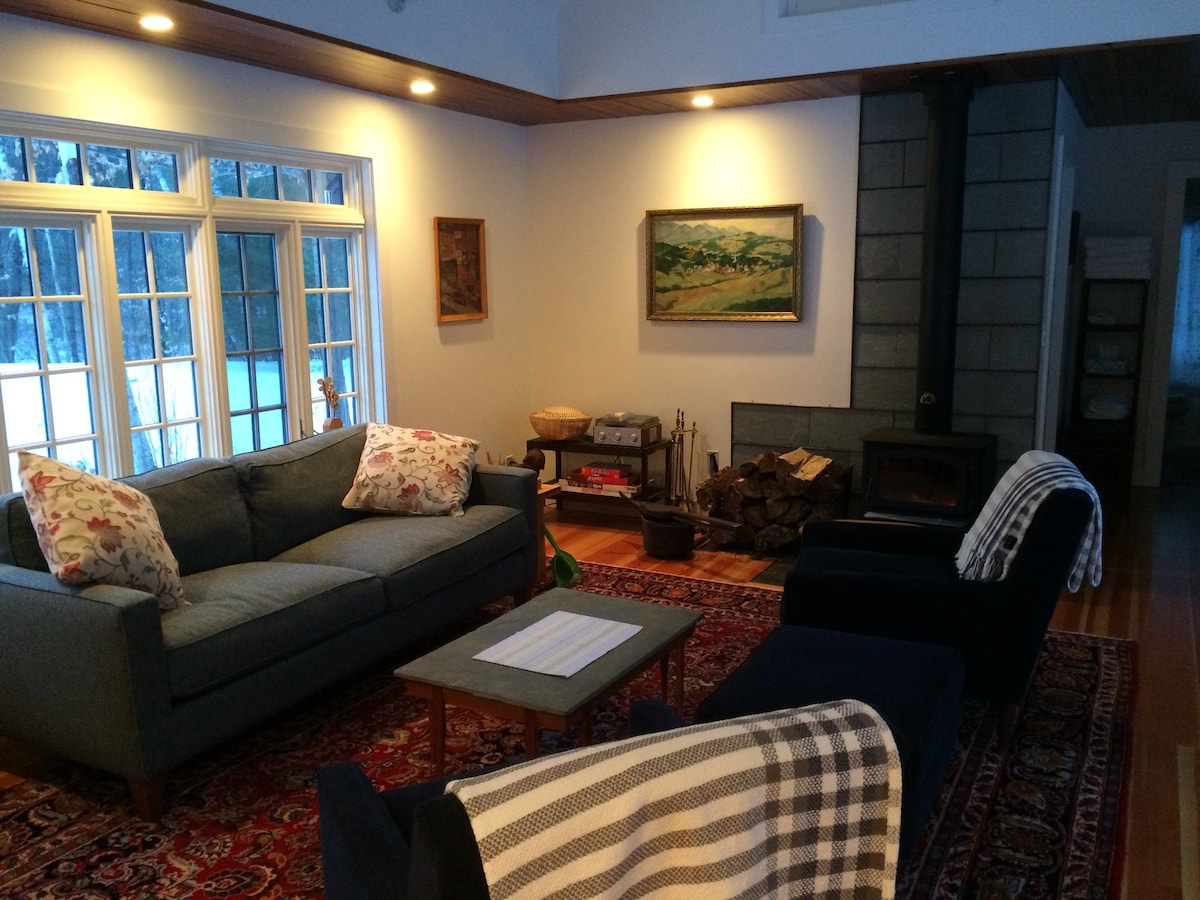 ¡Esquí de primavera! ¡Descuento de 20 %d en azúcar y nieve! Marzo es el azúcar de arce y la temporada de nieve GRANDE en Bretton Woods (a solo 20 minutos). Lujosa cabaña en estanque privado con jacuzzi, chimenea al aire libre, mesa de fuego de gas y vino de cortesía, cocina completa, porcelana fina, ducha nueva, bañera de hidromasaje, chimeneas eléctricas y dos espacios de trabajo. 68 acres + millas de senderos a un bosque estatal cercano, esta es la base perfecta para esquiar en temporada alta y una aventura invernal serena. ¡Se admiten perros!