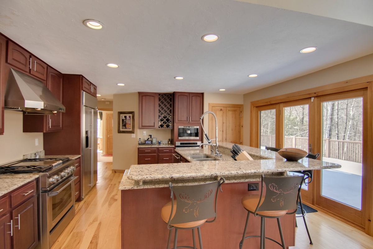 ¡Escapada a la montaña! Situada en el Bosque Nacional de las Montañas Blancas se encuentra Loon Mountain House, nuestra casa de 5 dormitorios (9 camas), 3,5 baños elegantemente equipada con impresionantes vistas a la montaña. Disfruta de los techos abovedados, las amplias zonas de estar/dormitorio, la chimenea de gas interior, la enorme terraza trasera y una sala de recreo en la planta baja con jacuzzi y sauna. Situado a solo 1 milla del albergue base de Loon y del Centro de Aventuras. ¡Relájate en el interior o sal y disfruta del aire libre! Hay mucho que hacer y ver en Lincoln.