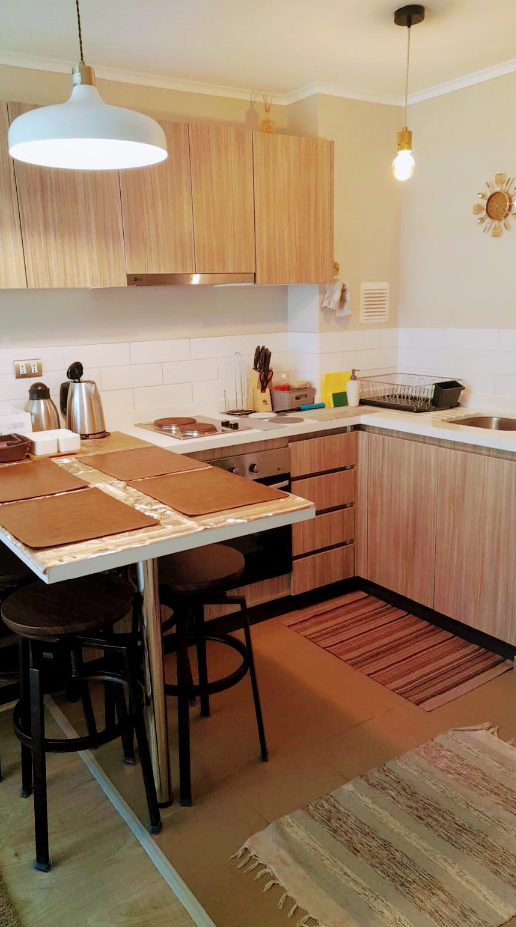 Nuevo y acogedor estudio en la mejor ubicación de Pucón, a pasos de playa grande, centro, y aislado del ruido de la calle principal. Cuenta con cama de 2 plazas, un futón de 2 plazas, cocina full equipada, baño completo, WiFi, TV 49" con Netflix, Disney+ y más, terraza, calefacción, parrilla, cafeteras, 2 bicicletas de uso ilimitado, entre otros. Estacionamiento público frente al acceso al edificio disponible. Incluye ropa de cama, toallas, e insumos básicos de baño y cocina para cada estadía.