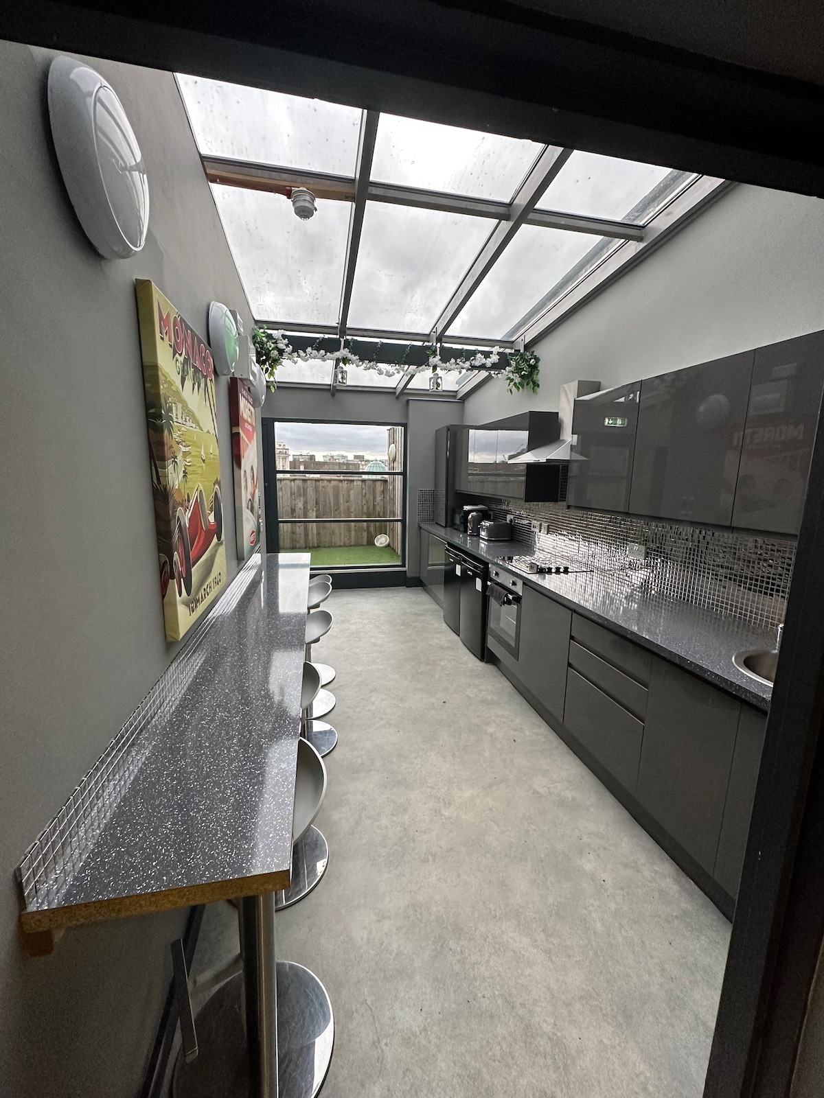 La sofisticada suite Penthouse es perfecta para grupos grandes o familias grandes. ¡El apartamento es grande y espacioso y ha sido diseñado a medida para los huéspedes que visitan nuestra gran ciudad! Hay una terraza en la azotea que se extiende a lo ancho del edificio con iluminación al aire libre y mesas y sillas para cenar al aire libre o solo algunos cócteles con familiares y amigos mientras disfruta del horizonte de Liverpool, ¿por qué no disfrutar del bar en la azotea con zona de bar cubierta al aire libre con calentadores?