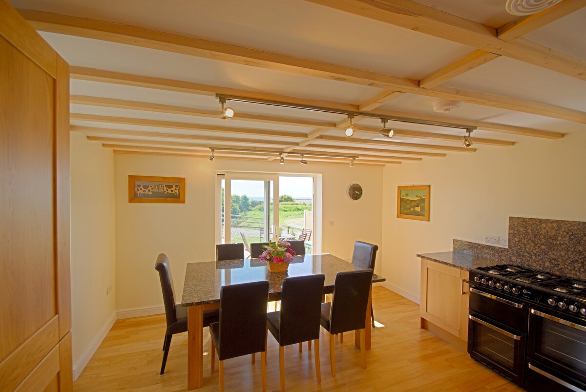 Una impresionante conversión de granero, situada en una «zona de excepcional belleza natural» con preciosas vistas al mar desde el salón y el patio. Ubicado en una pequeña finca dentro de 8 acres de campo abierto, a una milla de la playa. Ideal para huéspedes que disfrutan de la campiña abierta, senderos costeros, vida silvestre, aves y playas con vistas impresionantes, paz y tranquilidad. Golf, ciclismo y pesca también disponibles en Church Bay/Llanrhyddlad y sus alrededores. Capacidad para 6 personas en camas tamaño king o individuales.