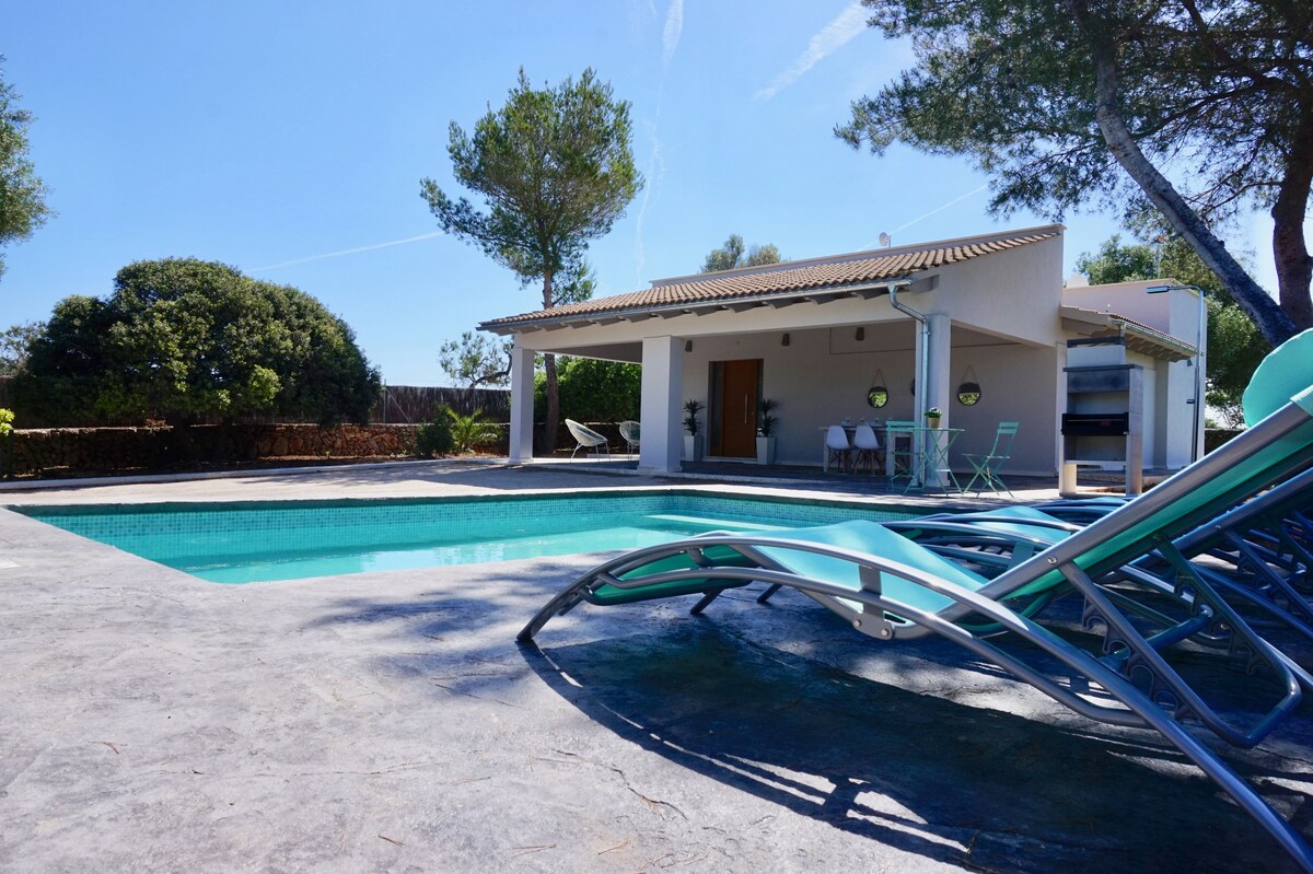 Casa mallorquina de más de cien años de antiguedad.Tiene planta baja y piso,en la planta baja tiene un dormitorio un baño,sala de estar y cocina comedor.En la planta superior hay dos habitaciones un baño una sala de estar y una terraza. La cocina tiene salida a un terraza cubierta seguida de terraza descubierta donde hay una enorme encina que da una sombra estupenda,a continuacion esta la piscina con terraza y una zona con cesped.