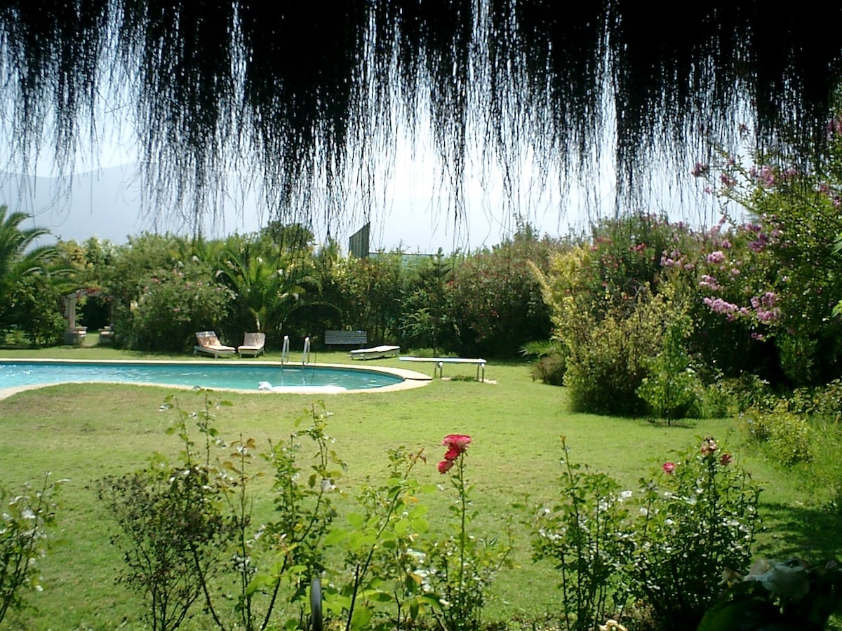 Lugar muy tranquilo y campestre ideal para disfrutar unos gratos días en familia y en contacto con la naturaleza. A sólo 7 minutos del centro de Olmué, Casa se encuentra ubicada en gran parcela con amplios espacios, mucha vegetación y hermosas vistas. Piscina, Cancha de Tenis, Juegos de niños, Parrilla y Horno de Barro. Casa equipada para 8 personas. 3 dormitorios, 1 baño y 1/2 , más 1 dormitorio y 1 baño en el exterior. Amplia sala, cocina equipada, chimenea y terraza,