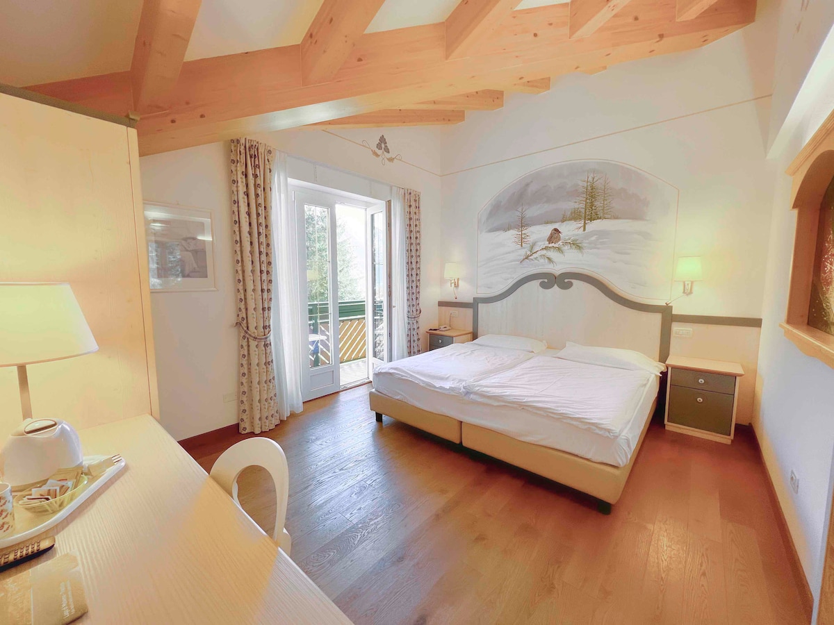 Room of about 22 square meters with double bed, balcony with panoramic view of our mountains or the valley. Larch floor and natural fir furniture. Private bathroom with window, shower and hairdryer. Possibility of adding a third bed (stay allowed with max 1 child) It is equipped with a safe, minibar, kettle with selection of teas and herbal teas, telephone, open bathroom with shower, separate toilet and bidet.