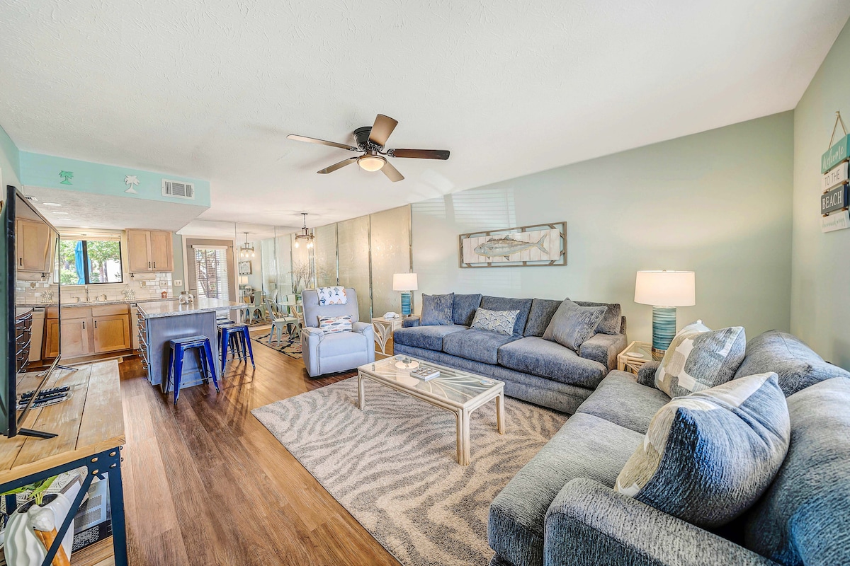 3 minute walk to the beach! Mostly newly renovated, 2 br 2.5 bath. Sleeps 6 Townhouse located in a gated community with 11 pools (5 heated) one pool located on the beach! shuffleboard, 4 tennis courts, gym, and 2 acres of mini golf. Golf cart rentals aval, We are centrally located to the areas main attractions and restaurants. Just a quick walk across the street from the beach. 2 numbered parking spaces right outside of the unit. Fully stocked kitchen with coffee/Keurig maker,Espresso machine.