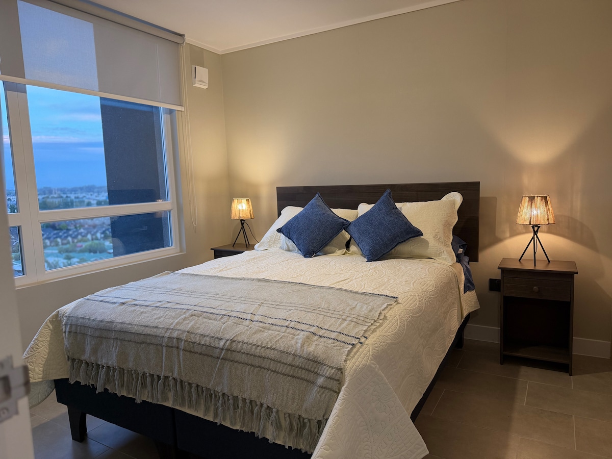 Departamento moderno y céntrico en Los Ángeles, ubicado en Av. Gabriela Mistral, cerca del hospital,supermercados, colegios y transporte público. Cuenta con 2 habitaciones, 2 baños (uno en suite), cocina equipada, living comedor con Smart TV y Wi-Fi y estacionamiento. Ideal para familias o profesionales que buscan comodidad, ubicación y tranquilidad en un espacio totalmente equipado.