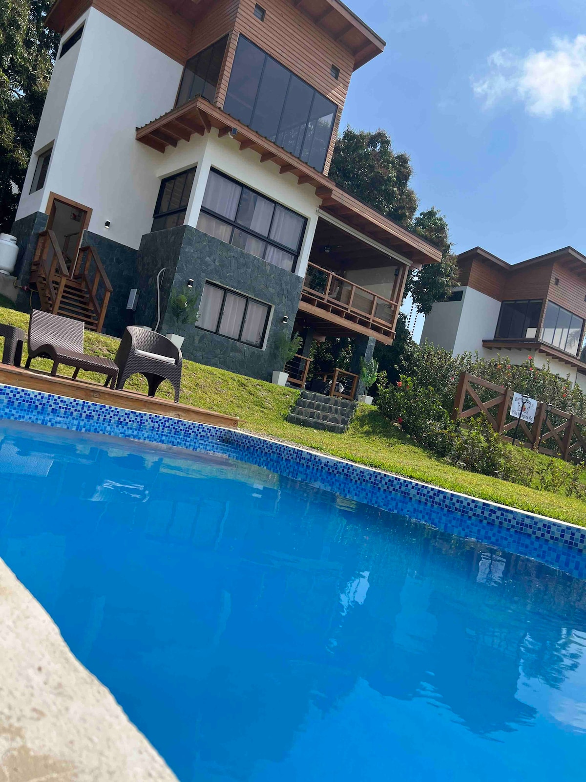 Hermosa villa para toda la familia, de tres plantas, ubicada en medio de dos reservas científicas, Ebano verde y Las neblinas, a 10 minutos de las piscinas naturales El arroyazo, una alternativa ideal para unas vacaciones en descanso, así como para celebraciones, pasadías familiares o de amigos, entre otros. Cuenta con pequeña piscina con calentador, terraza, chimenea, áreas de juegos de mesa y pared, mesa de billar, bbq a leña y carbón, tv, wifi, Netflix, Inversor.