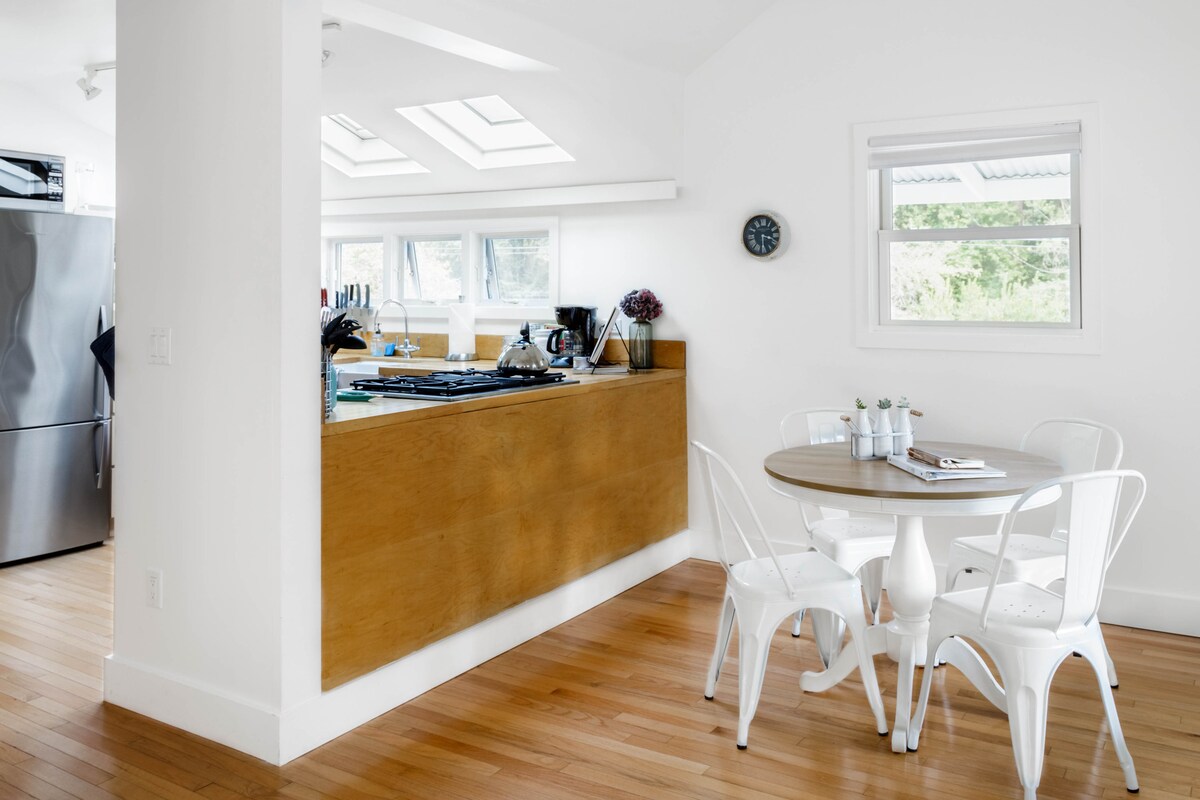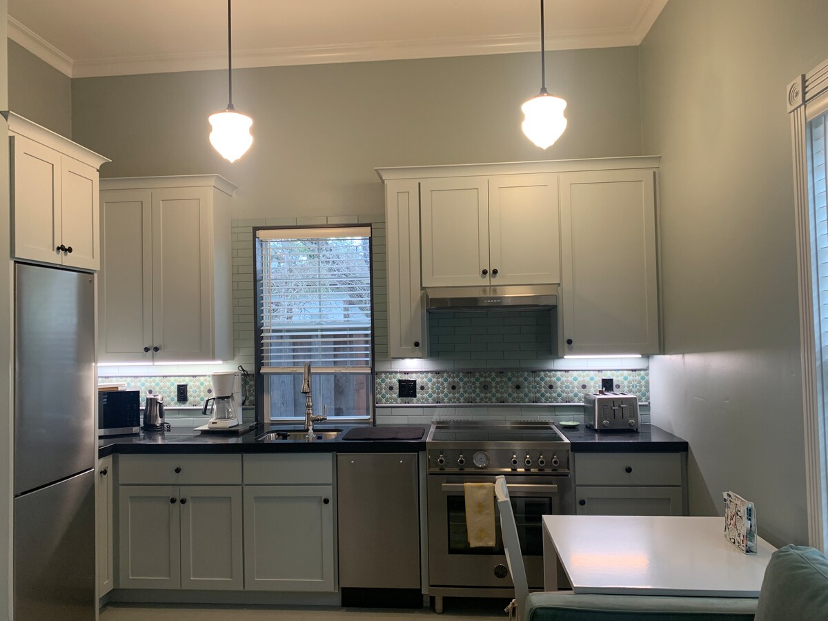 ¡Vacacionistas, familias extendidas, viajeros de trabajo con Internet rápido! ¡TODAS las comodidades y cocina gourmet! Cargo opcional por la instalación de una segunda cama, que se cobra después de la reservación. Enviaré un mensaje con las opciones. Cocina gourmet totalmente equipada, electrodomésticos de tamaño estándar, ¡también los pequeños! Baño completo: ¡gran ducha a ras del suelo con 2 accesorios de cabezal de ducha! Bidé y todos los servicios. Patio, fuente de agua, sillas Adirondack, mesa de bistró, ducha al aire libre: disfruta de forma privada. ¡Nombrado para proporcionar la máxima funcionalidad y relajación!