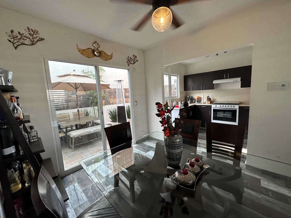 Casa de dos Pisos, cuenta con: 2 habitaciones una habitación con baño completo, sala comedor,cocina (refrigerador, horno de Microondas, licuadora, Estufa, utensilios de cocina) Cuenta con Internet patio de servicio, 2 baños completos y un medio baño, cochera, television de 50 pulgadas y una pantalla en la sala.