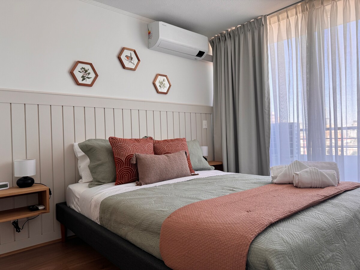 Lujoso apartamento de 1 dormitorio que ofrece una experiencia de vida contemporánea y de alta gama en uno de los barrios más vibrantes y buscados De Santiago. IMPORTANTE: Cuenta con ropa de cama, toallas y aire acondicionado. Disfrute de las vistas panorámicas de la ciudad y del cerro San Cristóbal desde la comodidad de su hogar. Espacio diseñado con elegancia y comodidad en mente. Habitación con cama matrimonial y mucha luz natural