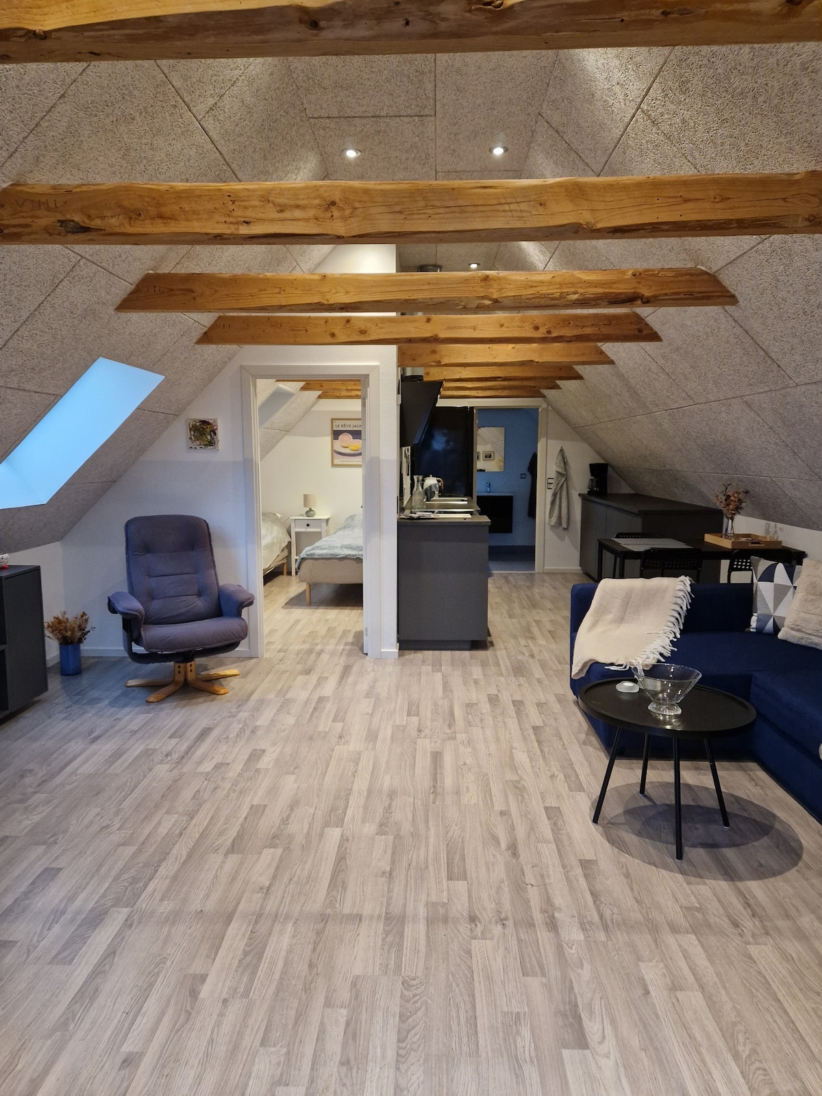 Ferielejlighed på 1. sal af vores nedlagte landejendom. Den er ca. 30m2. Her er dobbeltseng (160x200), lænestole, sofabord og TV. Spiseplads til 4 og et lille køkken med køl, frys, kogeplader, mikrobølgeovn, kaffemaskine, elkedel mm. Samt et badeværelse med bruser. Lejligheden er aflåst til resten af boligen, og har sin egen tagterrasse hvorfra der også er egen indgang. Fri wifi. Vi har 2 heste, høns og en sød udekat.