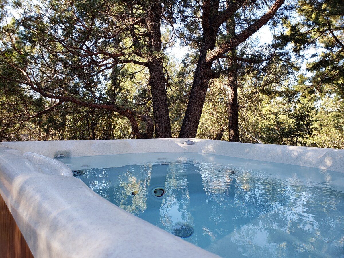 Ven al país de los pinos para disfrutar del aire fresco de la montaña y de una estancia relajante en la cabaña Serenity, que admite mascotas. Disfruta de una pequeña cabaña abastecida con bonitas vistas, terraza abierta, jacuzzi relajante, chimenea al aire libre (sujeta a restricciones locales de incendios), rutas de senderismo/lagos cercanos, internet rápido, espacio para trabajar desde casa, gran patio vallado y estufa de leña de estilo antiguo. Disfruta de tu velada con una deliciosa cena en la acogedora terraza seguida de un relajante baño en el jacuzzi mientras contemplas el cielo estrellado.