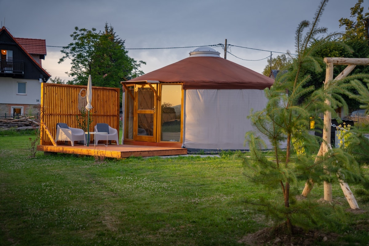 Una yurta totalmente equipada ubicada en una parcela tranquila de 30 áreas en el valle de Kłodzko. Está a 5 minutos en coche de Bard y de muchas tiendas de comestibles y a 30 minutos de Zieleniec. La zona inmediata está dominada por la naturaleza, que consiste en campos y montañas. Ten en cuenta que la leña no está incluida en el precio.