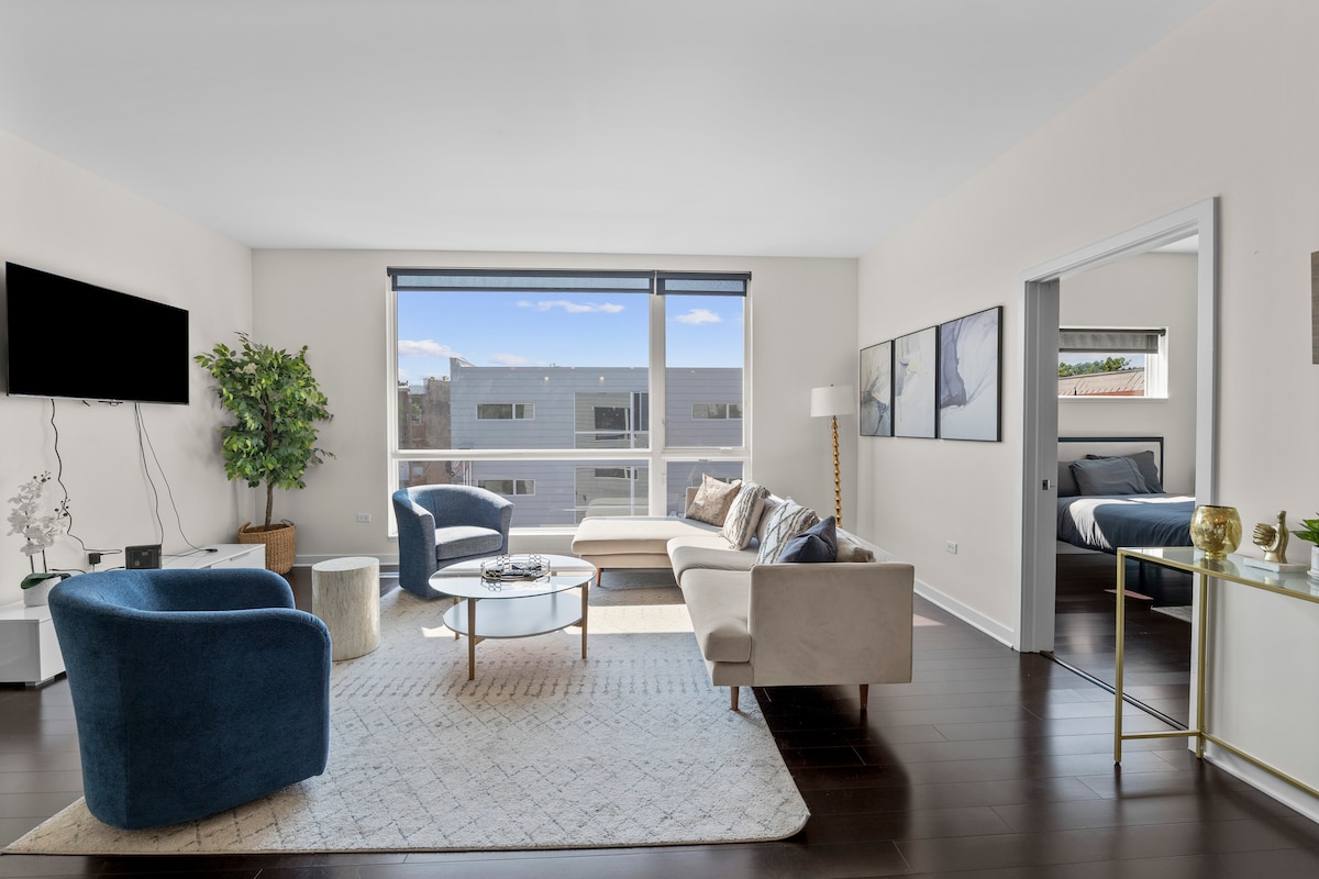 Disfruta de este espacioso y luminoso apartamento de 3 dormitorios y 2 baños con un diseño abierto y aireado ideal para familias, amigos o grupos. Cada dormitorio incluye una cómoda cama tamaño queen, y el principal cuenta con un baño completo privado. Prepara comidas en la cocina totalmente surtida, reúnete alrededor de la espaciosa isla o relájate en la sala de estar con un televisor Sony de 55". Con un espacio generoso para relajarse y conectarse, este condominio ofrece una verdadera experiencia de hogar lejos del hogar en Chicago.