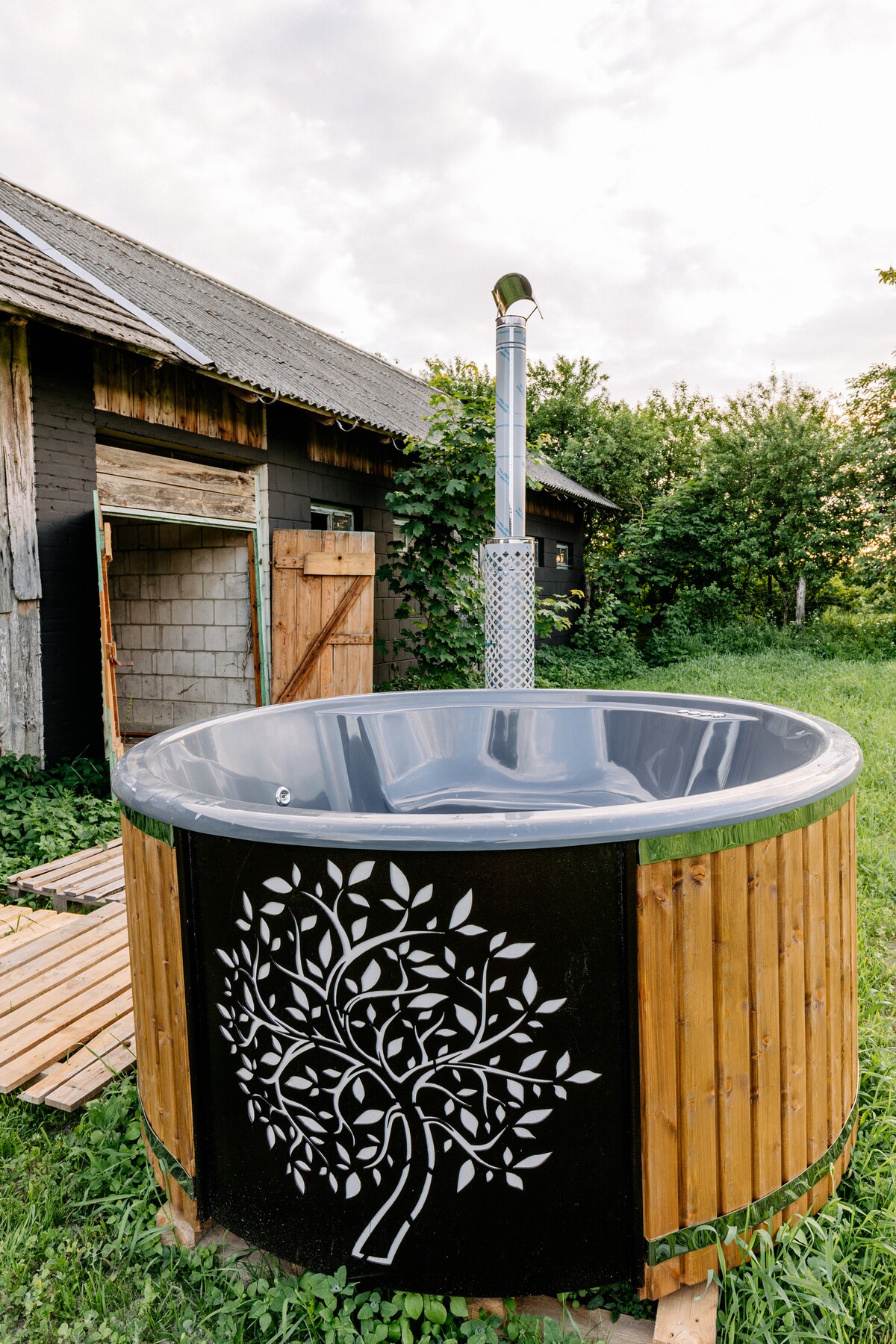 A year-round wooden cottage with a private electric hot tub, a fireplace, and a terrace nestled among the trees, nestled in the forest. It features a bedroom, a living room with a kitchen (fridge, kettle, microwave, hob, sink, kitchenware, table and chairs), and a bathroom. Underfloor heating, Wi-Fi, and air conditioning. The terrace overlooks the forest and a wild pond, facing southwest. The Green Velo cycling trail is 300 meters away. Nearby attractions include kayaking and nature reserves.